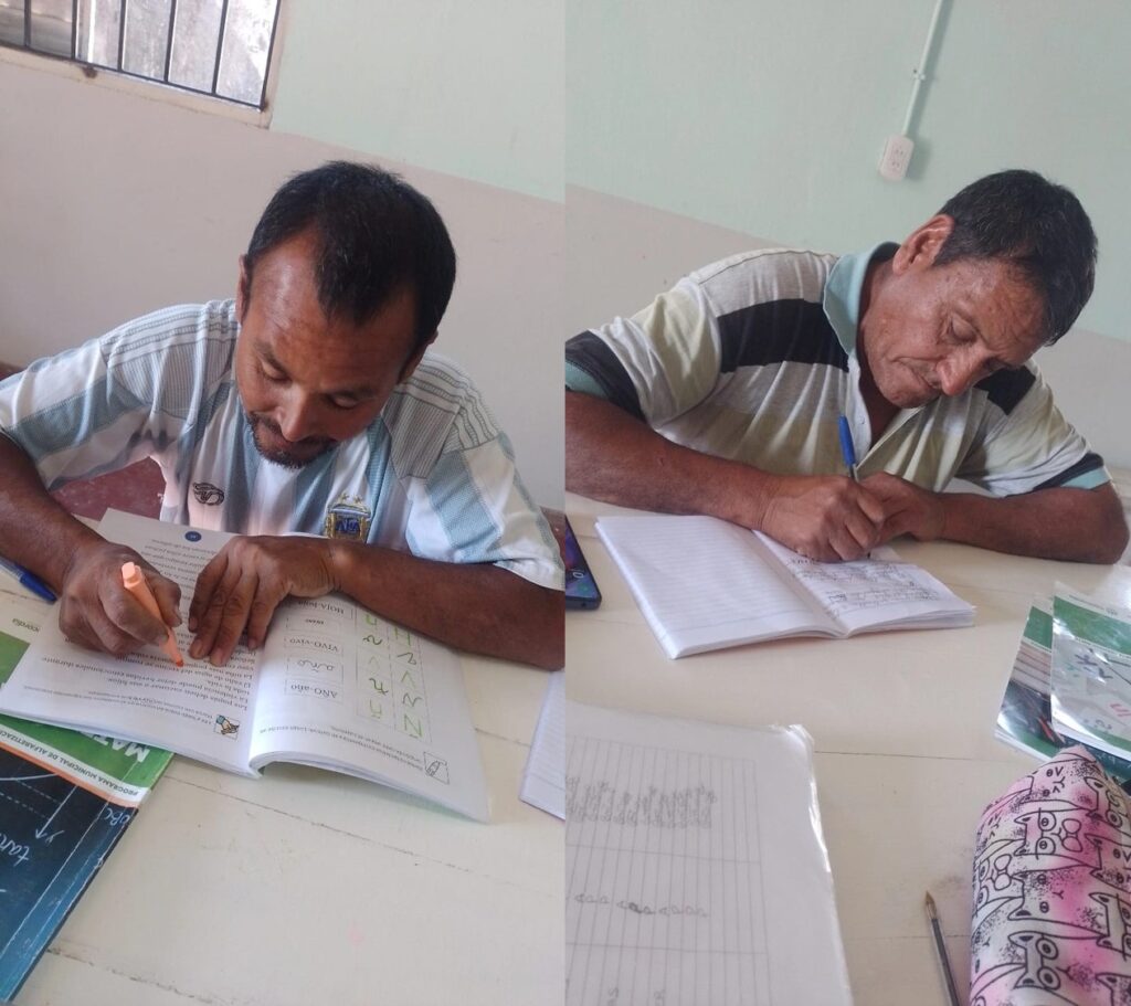 A pesar de las dificultades, los alfabetizandos avanzaron con perseverancia, trabajando con dedicación tanto en los libros de alfabetización como en sus cuadernos personales. Cada ejercicio se convirtió en un pequeño logro, cada palabra escrita un paso firme hacia adelante.