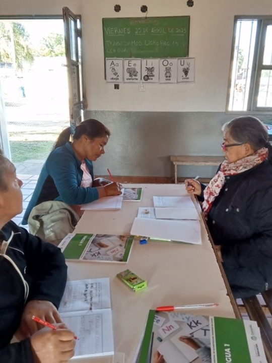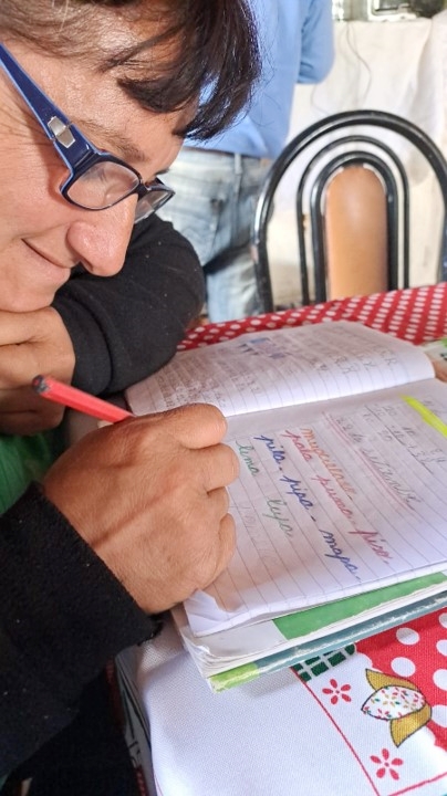 Sin embargo, la voluntad pudo más que los obstáculos. En la casa de Rosa —anfitriona y alumna— la palabra escrita empezó a manifestarse con fuerza. Rosa avanzó de manera notable: hoy lee y escribe oraciones, realiza con soltura el pasaje de imprenta a manuscrita y, aunque en numeración aún se le complica la lectura de cifras superiores a seis dígitos, aprende con una facilidad sorprendente. Además, incorporó el uso del reloj analógico y muestra un especial interés en avanzar en matemática, una herramienta que considera clave para su trabajo. Su esposo, por su parte, ya lee con soltura y dedica tiempo a practicar la escritura para mejorar su legibilidad, sin presentar dificultades en el área numérica.