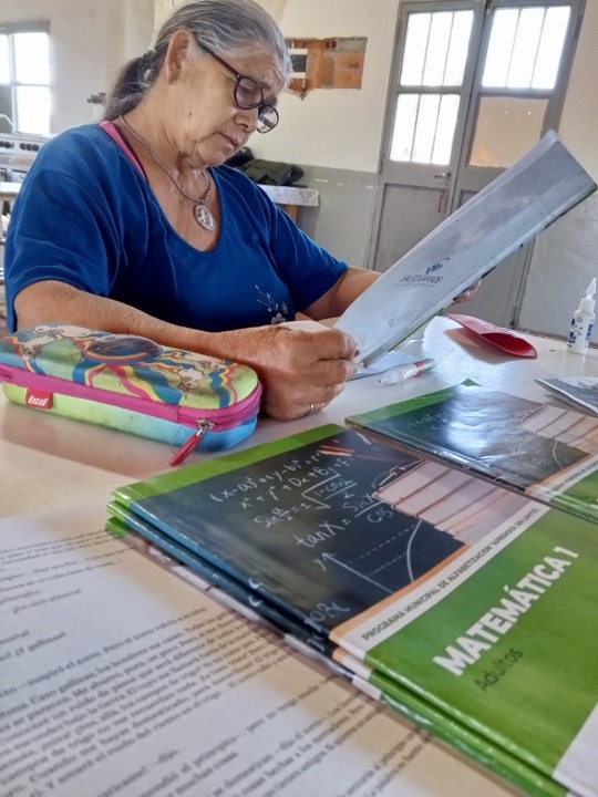 Otra de las estudiantes es Beatriz Piriz, de 67 años, una mujer de entusiasmo contagioso. Aprende con alegría y suele contar, con una sonrisa, que “a mi nieta le gusta mirar lo que hago en el cuaderno”. En su niñez, sus padres solo le permitieron concurrir unos meses a primer grado, lo que interrumpió por completo su alfabetización. Hoy, su principal motivación es apoyar a su hija en el kiosco familiar, que atiende todos los días, y para ello considera fundamental mejorar su lectura, escritura y cálculo.