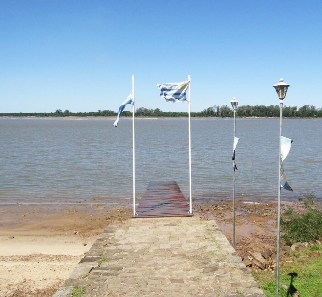 A orillas del Río Uruguay, el muelle, presidido por los símbolos patrios de Argentina y Uruguay, el punto de partida y llegada de pasajeros, que se mantiene en pie aún y constituye una porción de la historia lugareña.