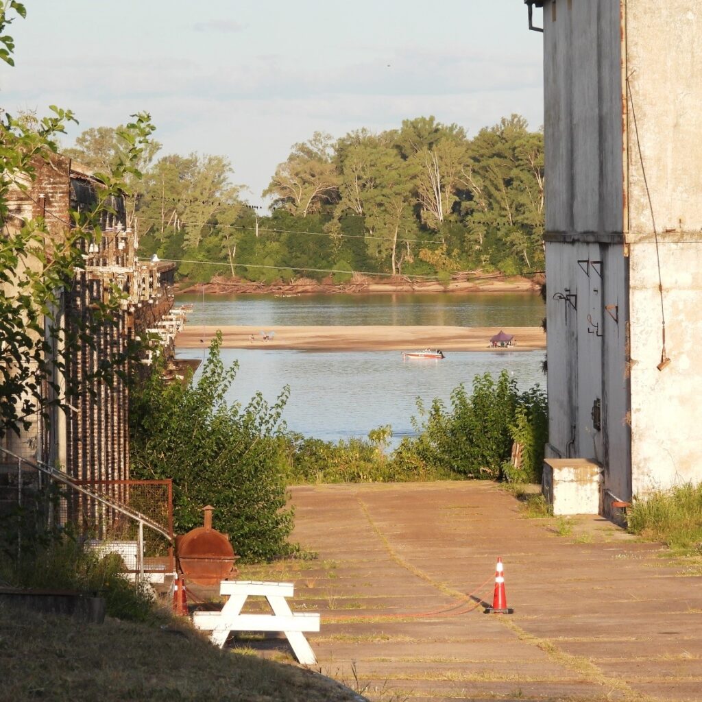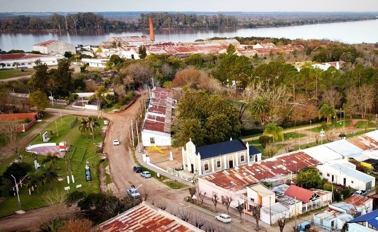 Una imagen que muestra la conexión directa entre la Fábrica y el Río Uruguay, ese cauce de agua gigante, que bordea al poblado, y que tan funcional a la empresa fue en su época dorada.
