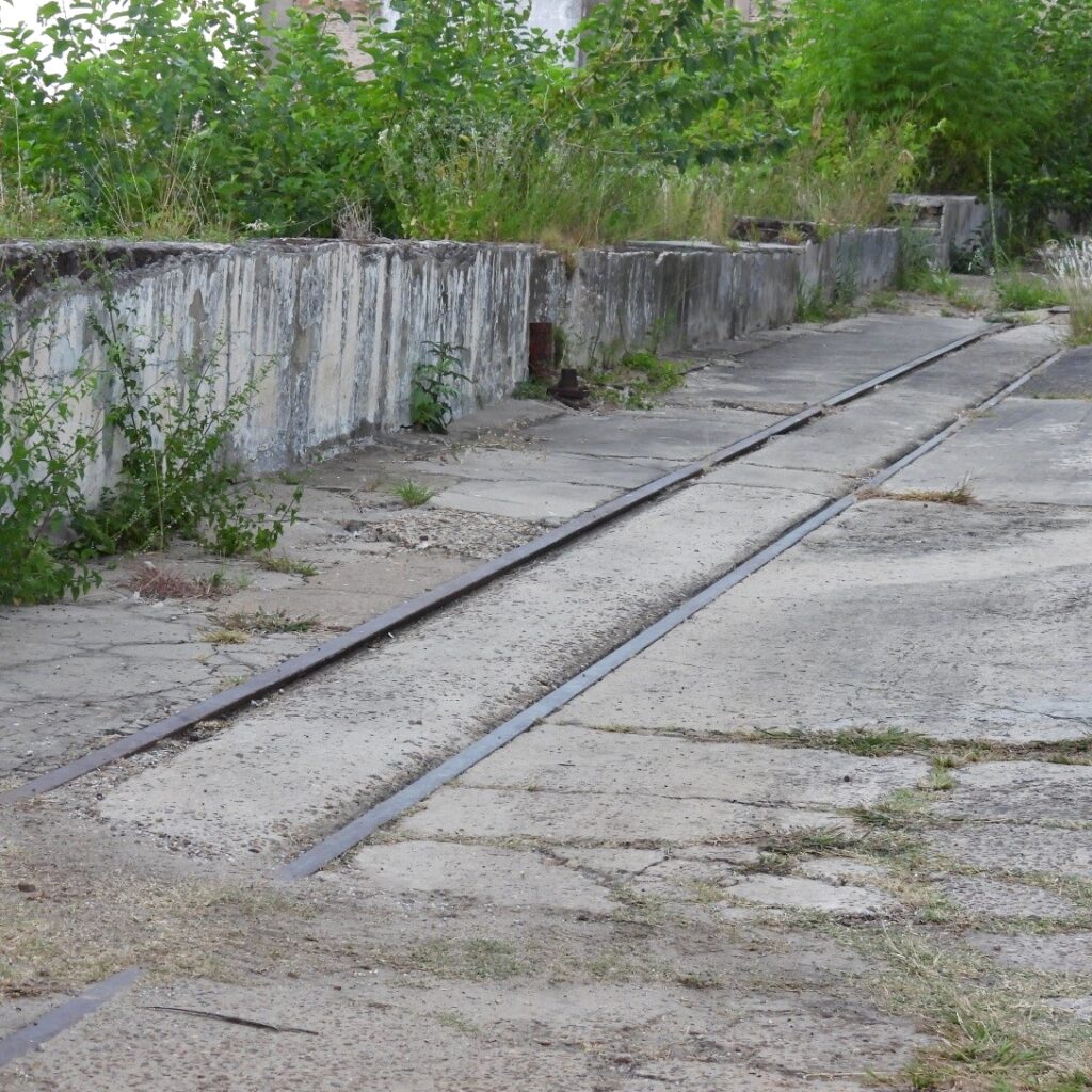 Restos de una red ferroviaria para zorras de tracción a sangre, tiradas por mulas, que trasladaban las distintas cargas de un galpón a otro.