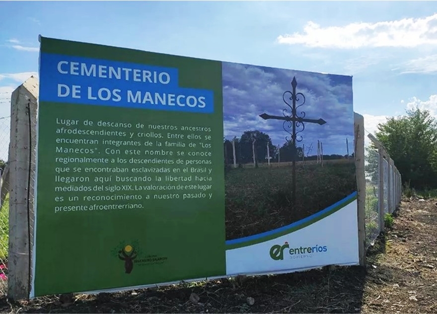 Entablamos un diálogo muy grato con uno de los autores del libro al que hacíamos referencia, el Profesor Ricardo Moreyra, afrodescendiente, que integra la Agrupación Entre Afros, con sede en la ciudad de Paraná. Mientras trabajaba en carácter de Profesor de Historia en la Escuela Secundaria N° 13 “La Capilla”, de Ingeniero Sajaroff, junto a un grupo de alumnos, y al Profesor Nahuel Oviedo, llevaron adelante una investigación sobre el Cementerio de los Manecos, denominada “Tras los pasos perdidos”, que pudo ser presentada en distintos lugares del país, con un buen impacto social y educativo.