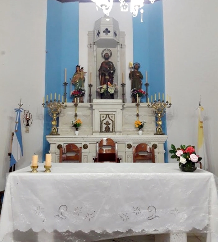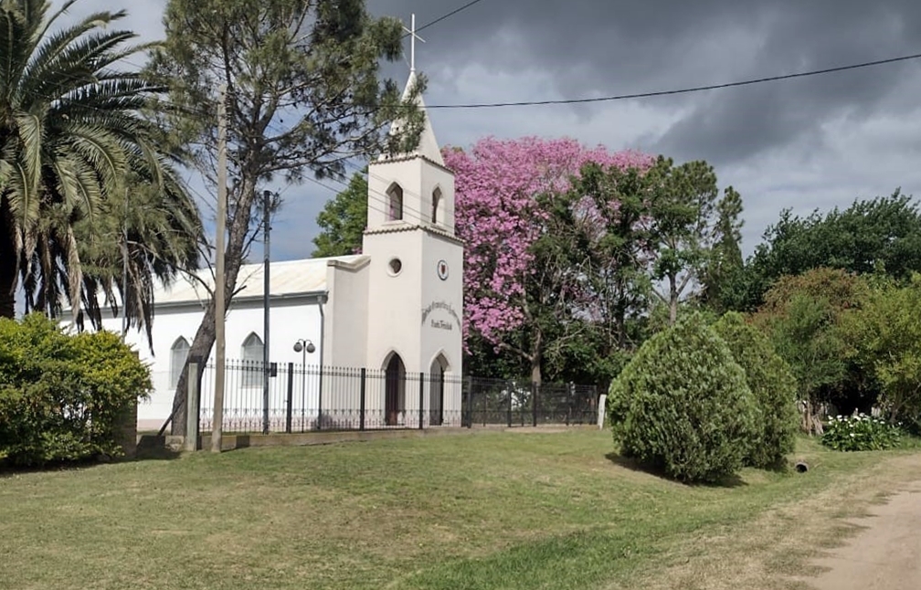 Nos refería la Sra. Ramat que, por relatos de vecinos, las primeras celebraciones se realizaban en sus casas, mientras se concretaba la construcción del templo, sobre un terreno que había donado el Sr. Anselmo Etchegorry, sobre la calle central del poblado. La primera comisión se reunió en septiembre de 1914, pero fue un poco más tarde cuando se decidió el inicio de la obra.