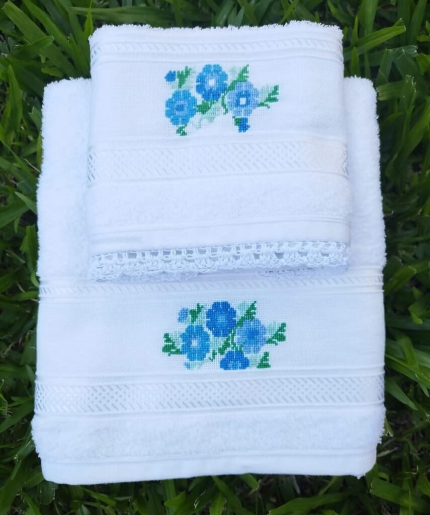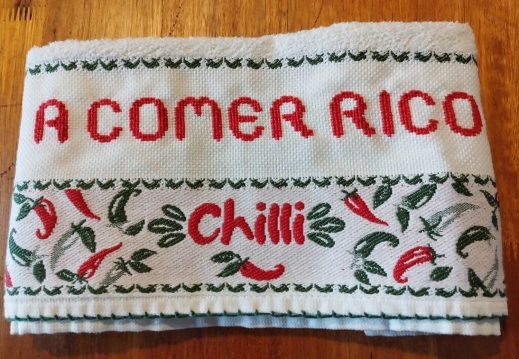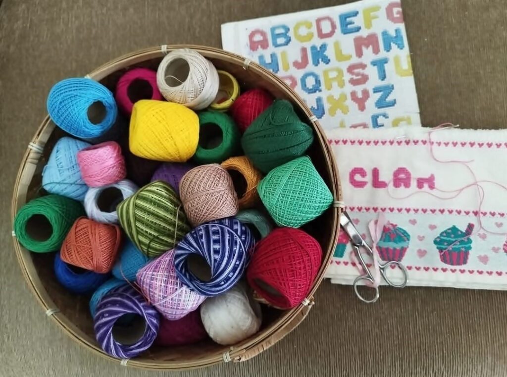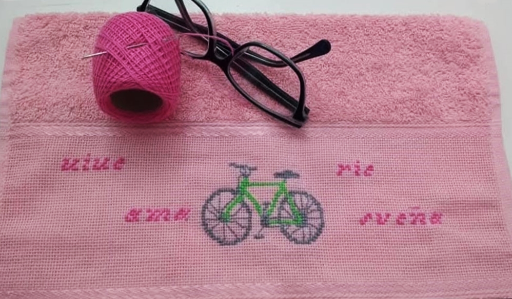 Con felicidad nos decía Marina que atesora un cúmulo de cosas de distintas épocas, como hilos en carreteles de madera, que eran de su abuela, hilos de una vecina que al irse del país se los regaló. También conserva revistas muy antiguas, aunque hoy Internet provee de numerosas ideas; pero el proceso para tomarlas es mucho más complejo, se vuelcan los diseños en hojas cuadriculadas y se van haciendo cruces con los diferentes colores; se cuentan los puntos para que queden equitativamente en el soporte, que puede ser repasador, toalla, babero, entre tantos.